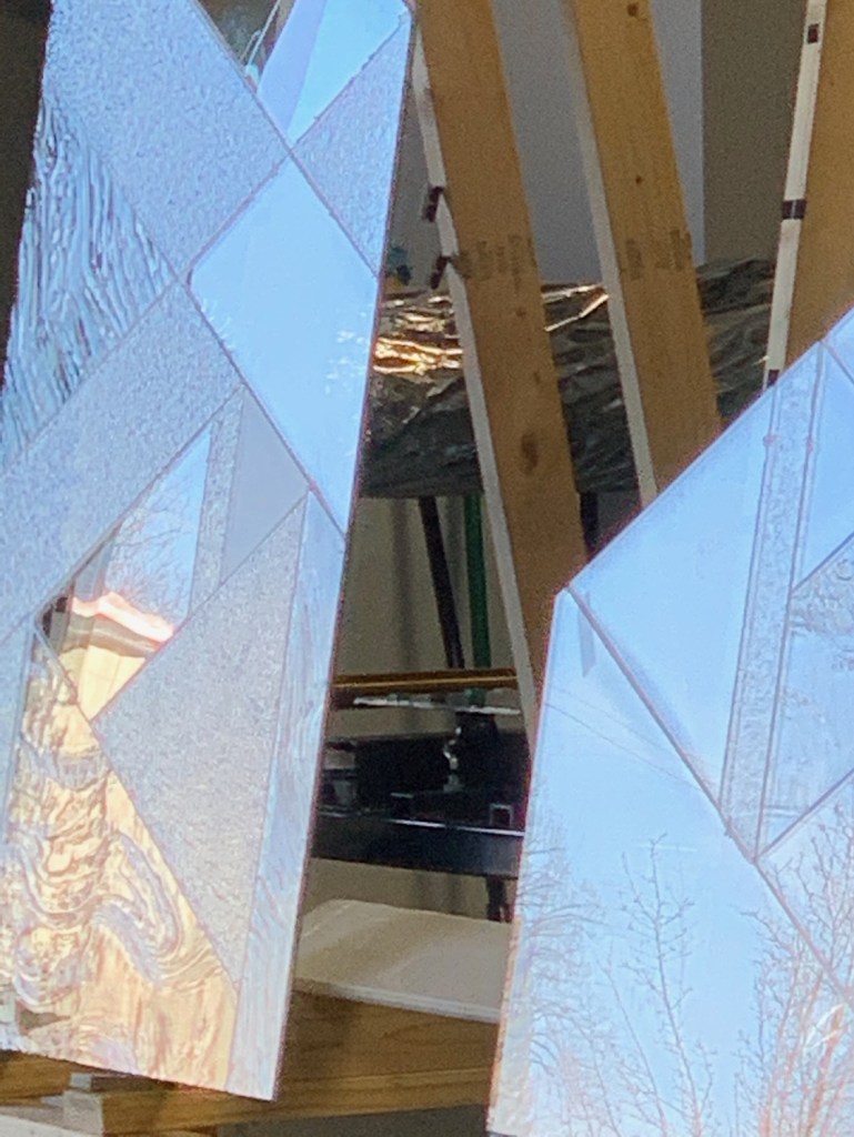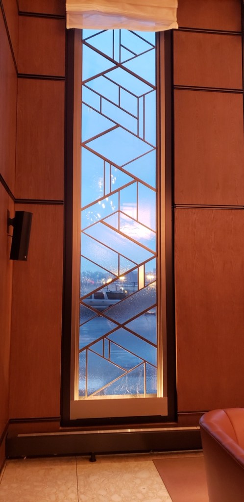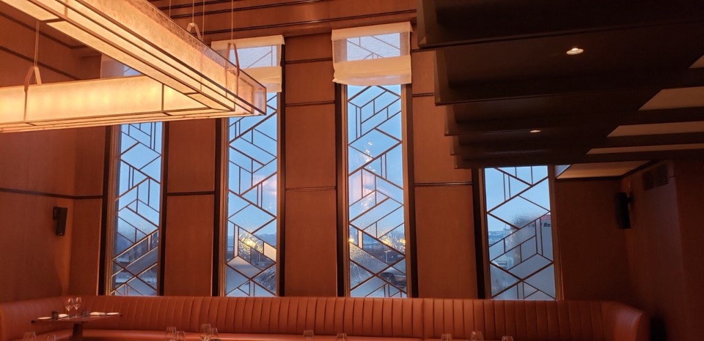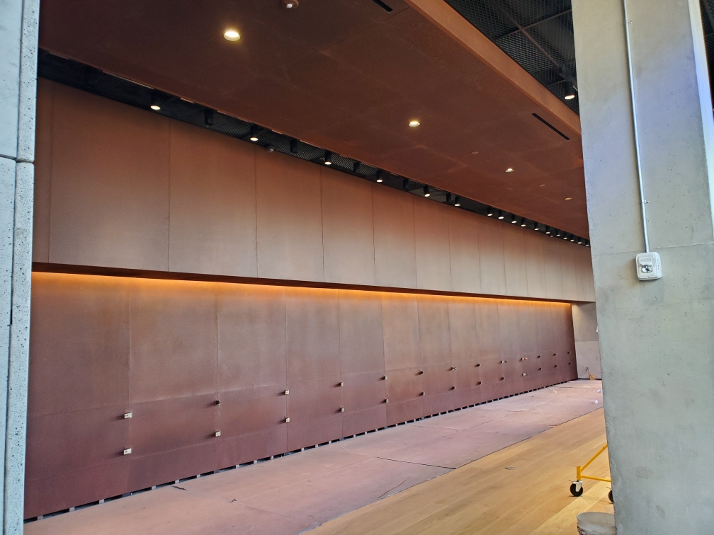 steel hinges. Ceiling “cloud” system developed by Axis.Spyscape NYC- Curved Corten wall panels on security “Drum”. 20′ high by 60′ diameter.Wine Spectator / Hudson yards- Art glass windows 15′ high x 3′ wide.Glass assembly method unique and proprietary to Axis, combining different textures into one panel.